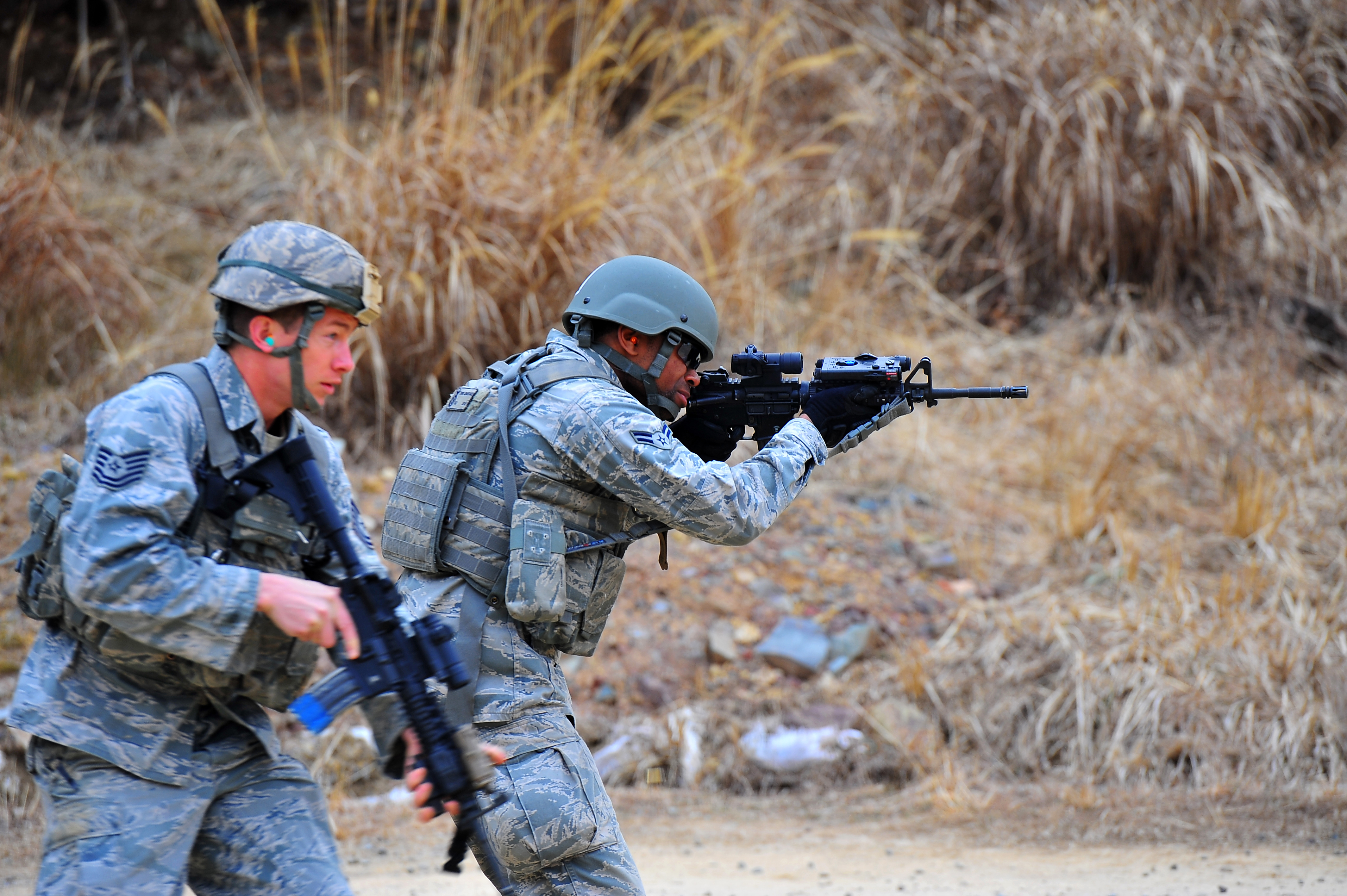 Tech. Sgt. Michael Yurco (left) and Airman 1st Class Chris Quaintance, 51st Security Forces Squadron members, demonstrate a cover and move shooting drill for their Korean counterparts at Jinjui Air Force Education and Training Command firing range Republic of Korea, March 7, 2013. The 51st SFS and ROKAF air police members demonstrate different shooting techniques in order to learn new ones and to perfect their own. (U.S. Air Force photo/Staff Sgt. Emerson Nuñez)