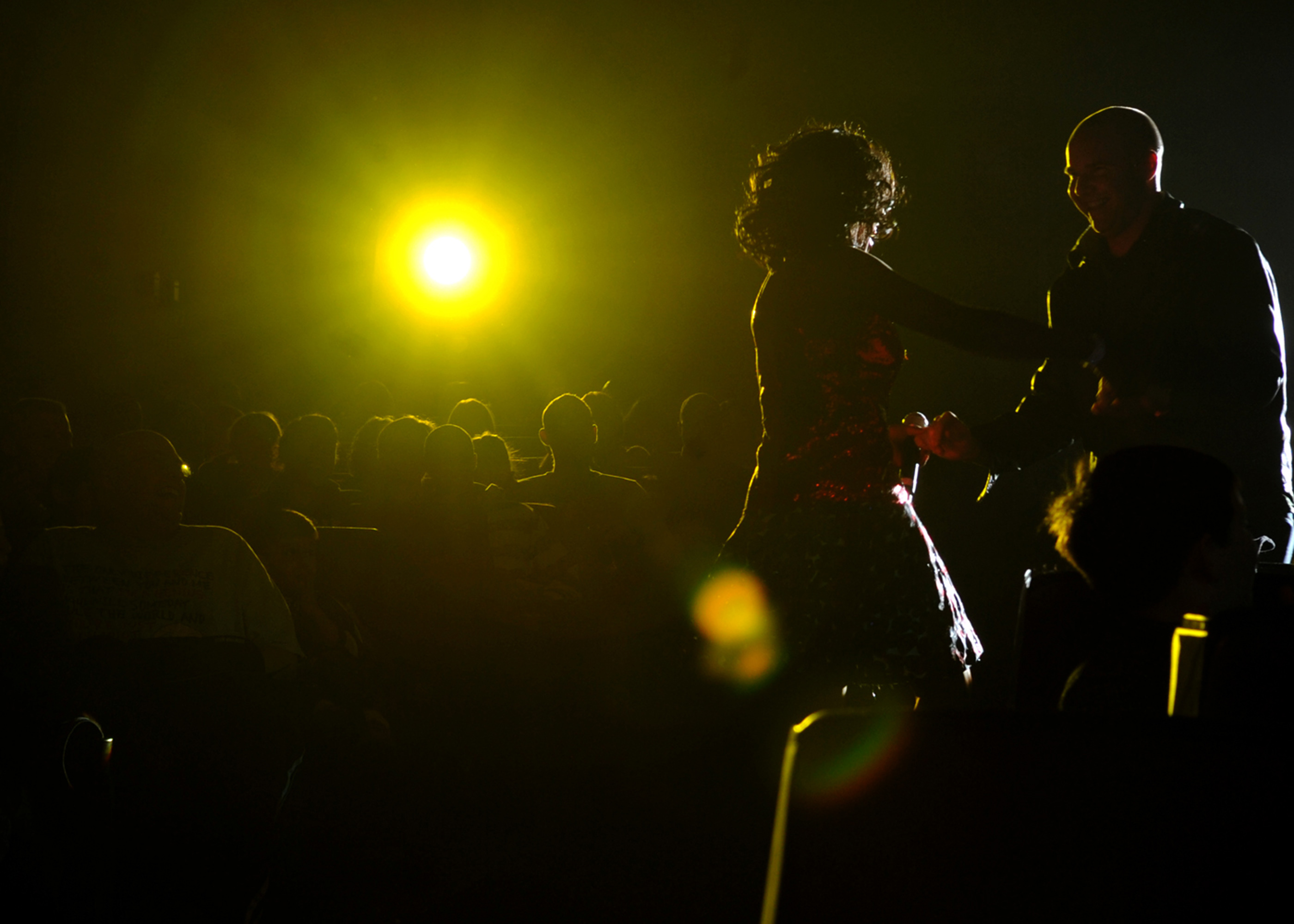 A Tops in Blue performer dances with an audience member at Osan Air Base Jan. 9. The Tops in Blue 2010 World Tour "We Believe" is a salute to the ideals we believe in as Americans. The show featured rhythm and blues music, and renditions of songs from artists including Michael Buble, Lady Gaga and the Black Eyed Peas. (U.S. Air Force photo/Senior Airman Evelyn Chavez).
