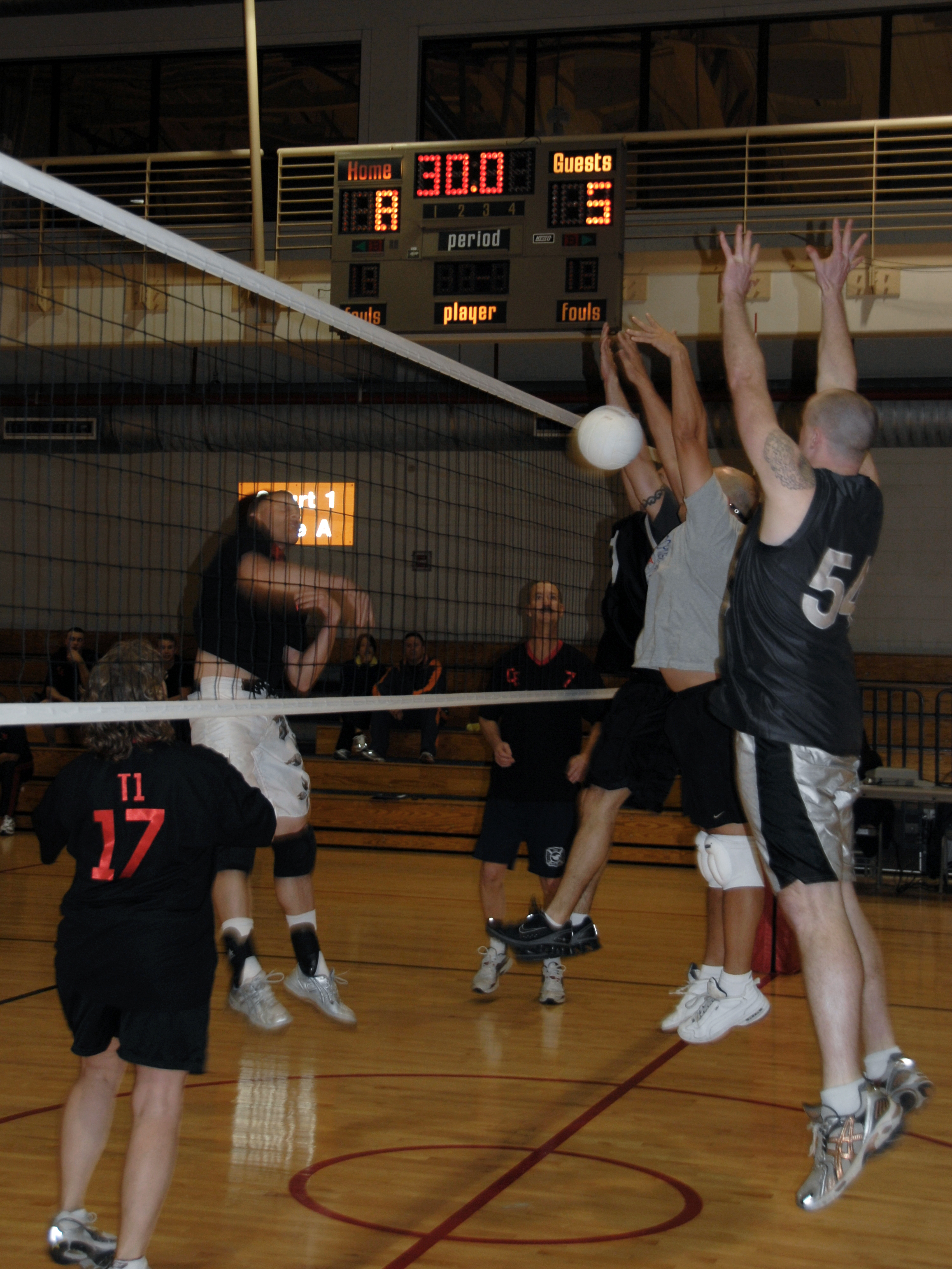 The 51st Fighter Wing intramural volleyball team, right, competes against the 51st Civil Engineer team April 29 at the fitness center on Osan Air Base, Republic of Korea. The 51st FW team, comprised of the 51st Comptroller Squadron and wing staff agencies, prevailed in three sets and improved to a 6-3 record. The 51st CES team dropped to 7-2. Three games remain in the regular season. (U.S. Air Force photo/Staff Sgt. Eric Burks)