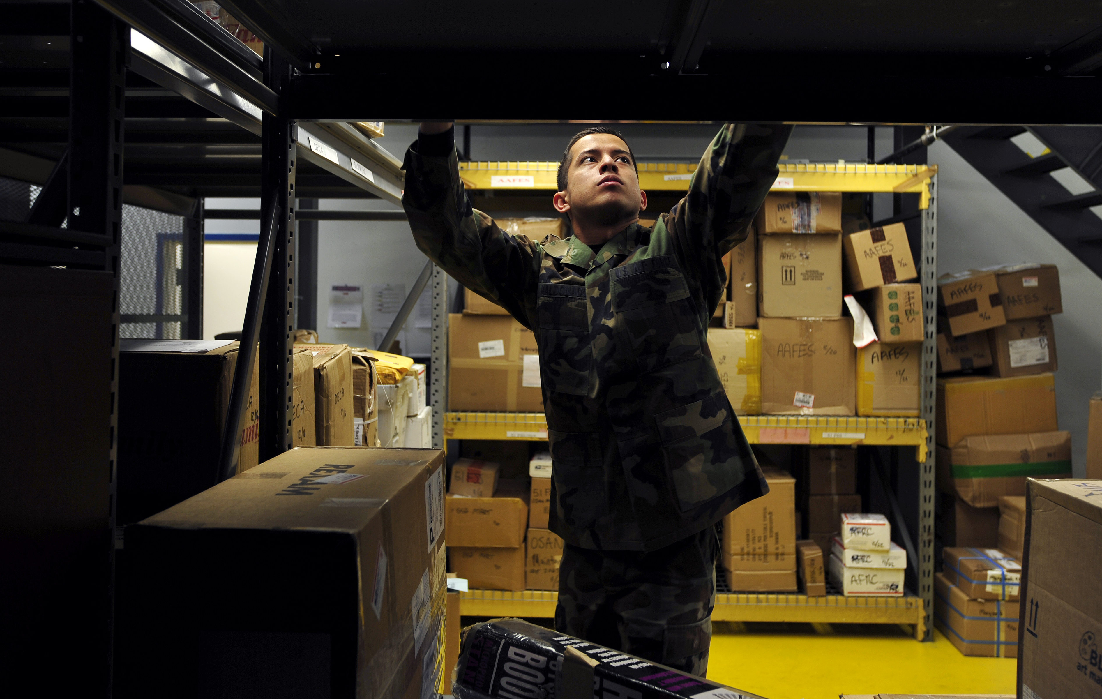 Postal clerks unload and begin to sort more than 10,000 pounds of mail from a truck at Osan Air Base, Republic of Korea, Dec. 22. During the holidays, the Osan Post Office receives more than 2,000 packages and 4,000 letters every day, and the average weight of an arriving postal truck goes from 2,000 to 10,000 pounds. (U.S. Air Force photo/Staff Sgt. Brian Ferguson)