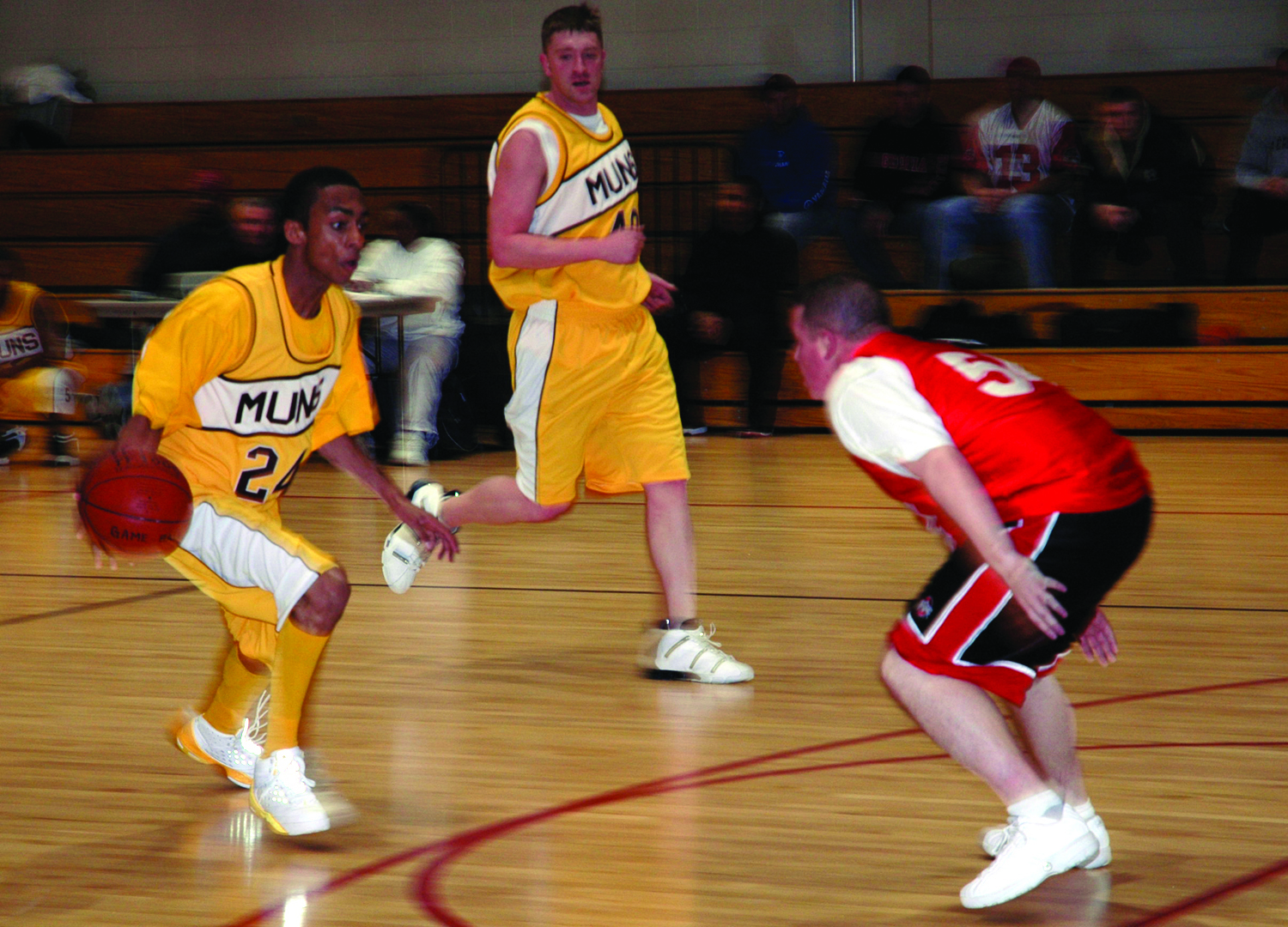 OSAN AIR BASE, Republic of Korea -- Roderick Henderson, left, and Adam Fralick, 51st Munitions Squadron (A Team), try to break past Tim Morgan, 5th Logistics Readiness Squadron. 51st MUNS went on to beat 5th LRS, 58-47. (U.S. Air Force photo by Staff Sgt. Benjamin Rojek)