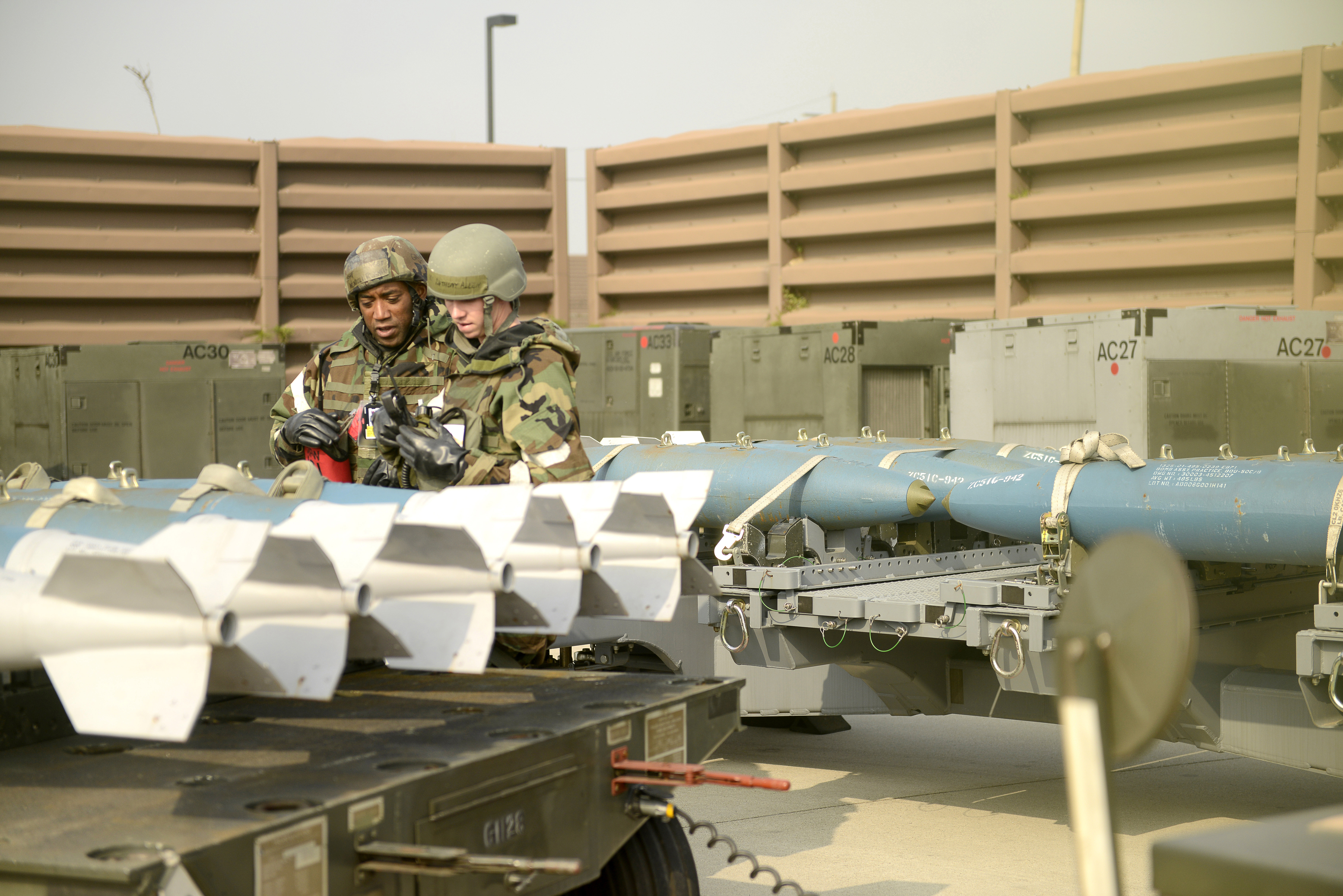 Master Sgt. Wendell Runnels (left), 51st Fighter Wing Inspector General Office deputy inspector, examines vehicles on the flight line to ensure they are properly marked with M-8 chemical detection paper during Operational Readiness Exercise Beverly Bulldog 14-02 at Osan Air Base, Republic of Korea, May 9, 2014. M-8 paper detects nerve and blister agents and is used during exercises and real world contingencies for contamination control procedures. (U.S. Air Force photo/Tech. Sgt. Micky M. Pena)