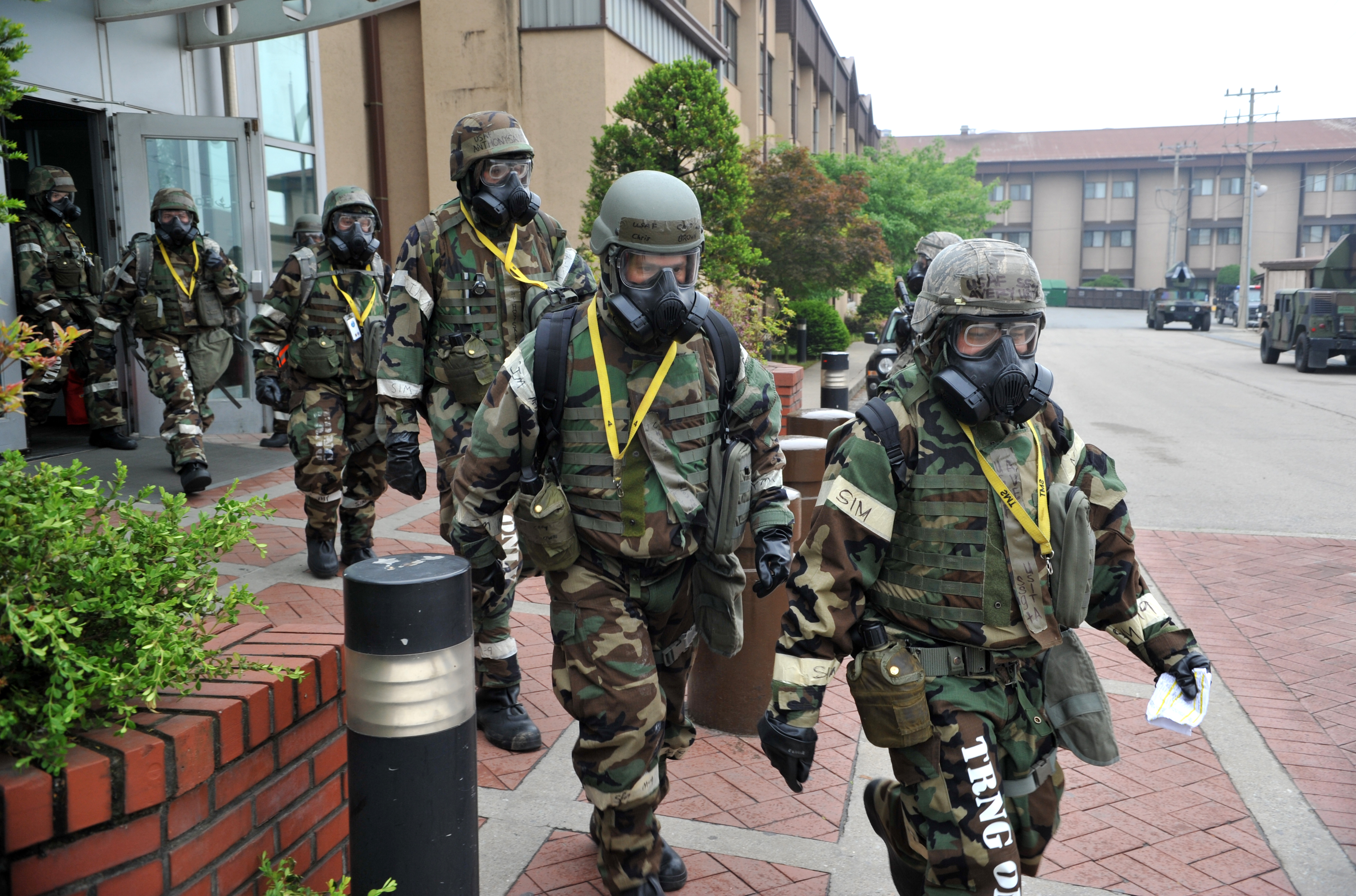 The base’s emergency operations center personnel exit the fitness center on their way to an alternate duty location during a bugout scenario as part of Operational Readiness Exercise Beverly Bulldog 14-02 at Osan Air Base, Republic of Korea, May 8, 2014. The group evacuated Bldg. 1097, and with the help of the 51st Security Forces and Logistics Readiness Squadrons, arrived at an alternate duty location safely. (U.S. Air Force photo/Airman 1st Class Ashley J. Thum)