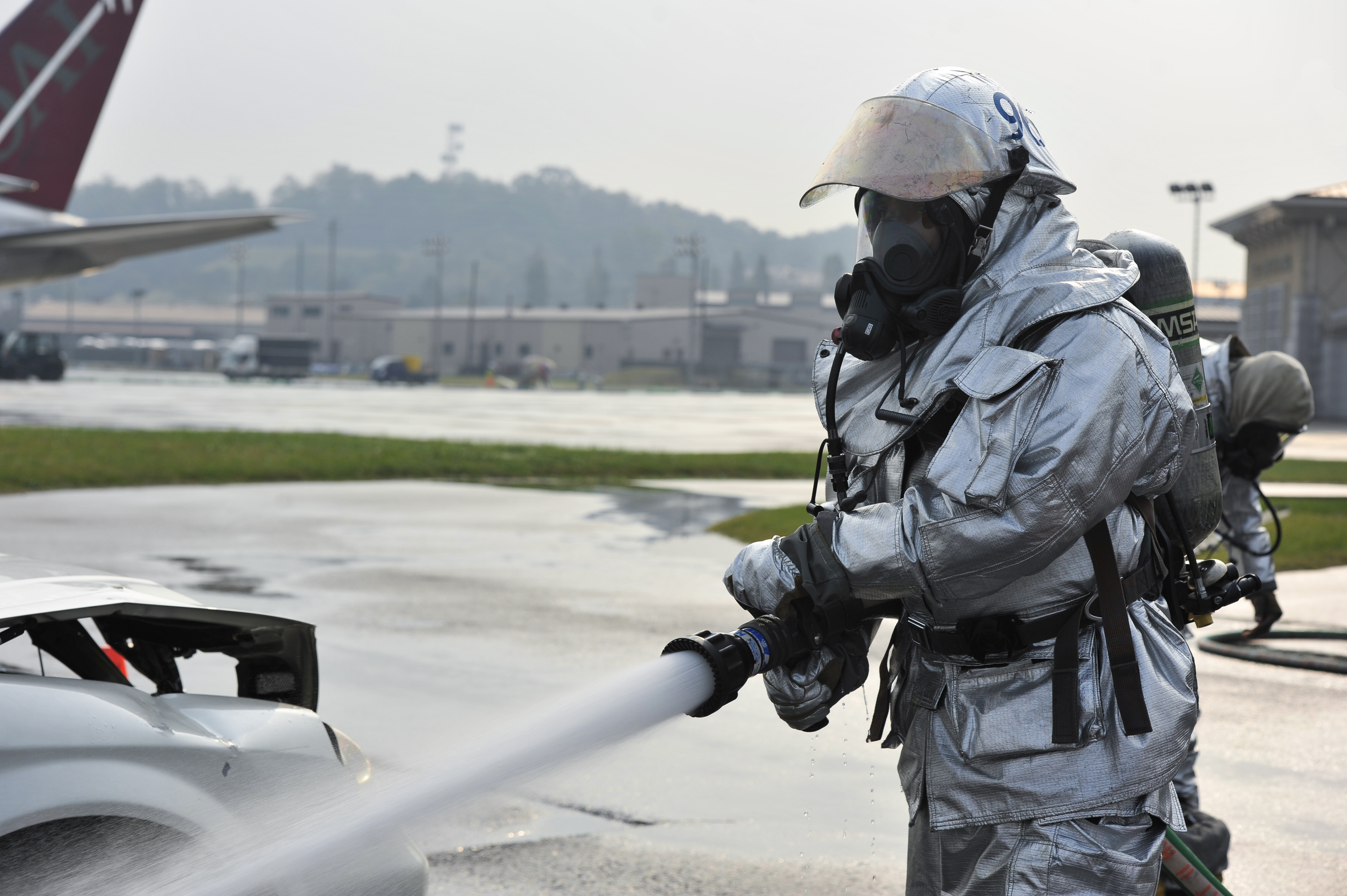 Staff Sgt. Lee Mathews, 51st Civil Engineer Squadron fire emergency services crew chief, puts out a fire during a training scenario Oct. 16 on Osan Air Base, Republic of Korea. Mathews is this week’s Airman Spotlight winner. (U.S. Air Force photo by Senior Airman David Owsianka)