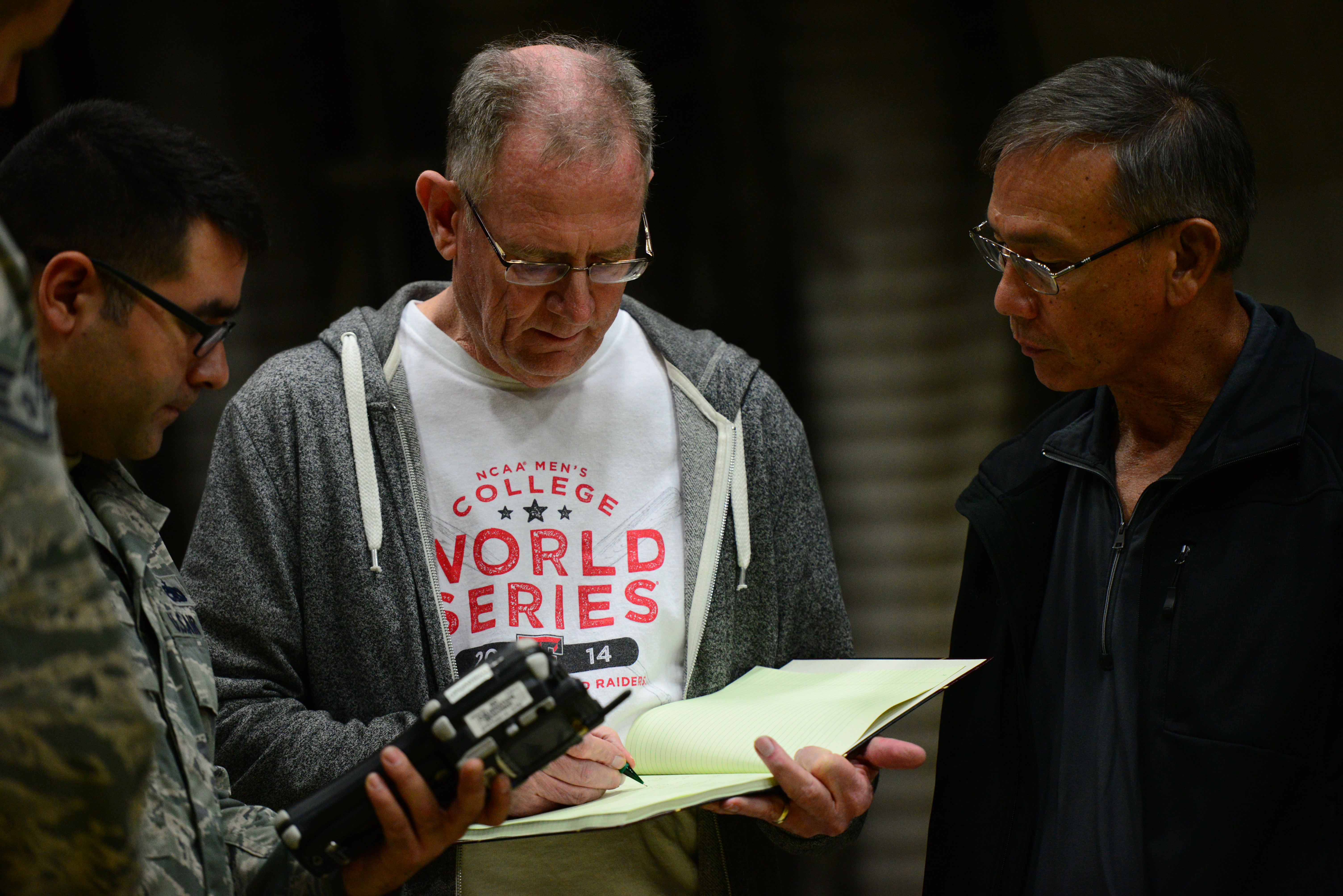 Tech. Sgt. Brandon Mulford, 51st Maintenance Group quality assurance manager along with Lockheed Martin representatives review data gathered during the hands-on portion of a weight and balance course taught at Osan Air Base, Republic of Korea, Oct. 14, 2015. The class trained both ROK and U.S. quality assurance Airmen on specialized aircraft systems, which checks and measure the weight and balance of an aircraft. (U.S. Air Force photo/Staff Sgt. Amber Grimm)
