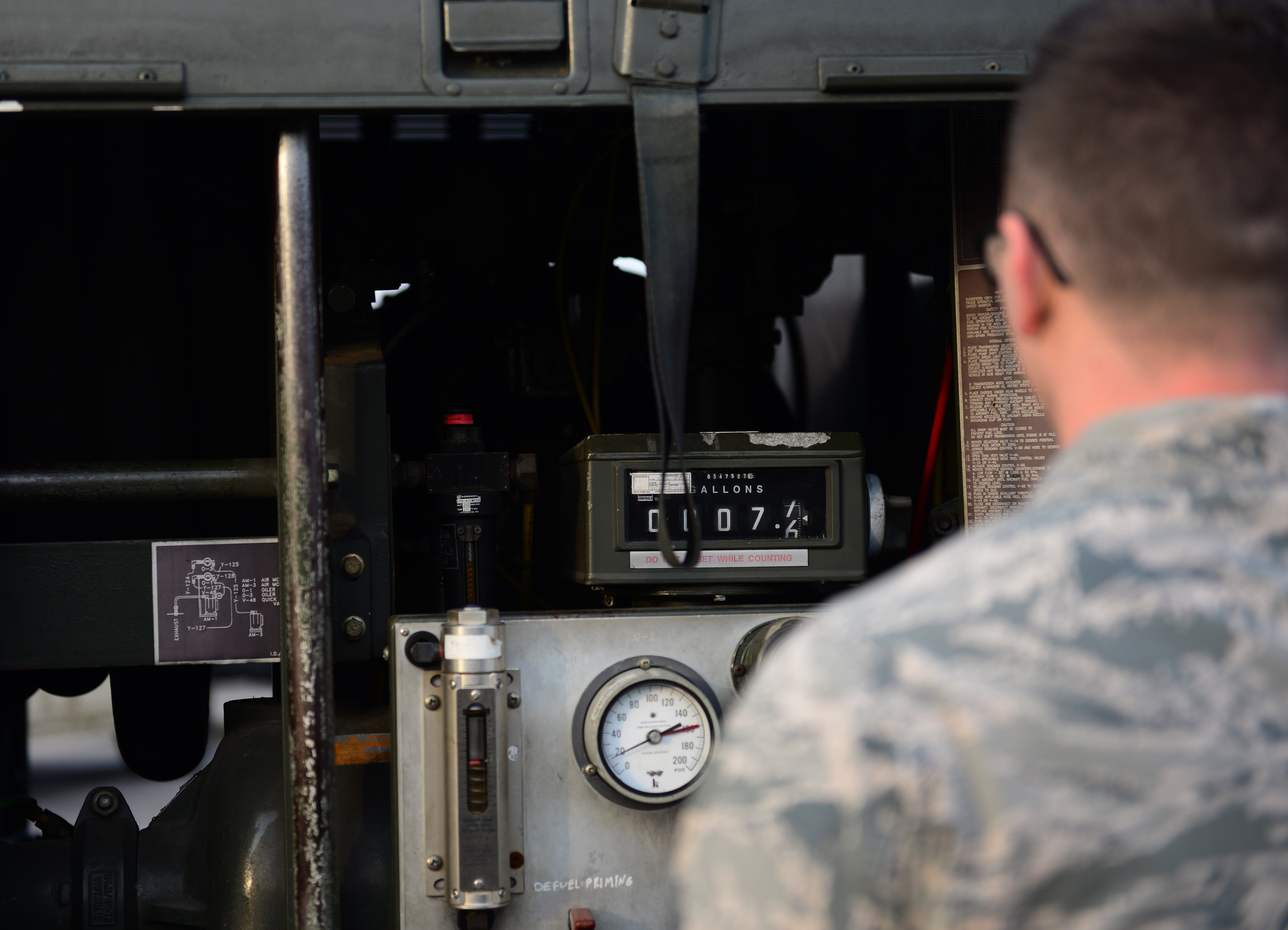 A 51st Logistics Readiness Squadron petroleum, oils, and lubricants Airman, monitors the amount of fuel being drained for testing from an R-11 mobile fuel truck at Osan Air Base, Republic of Korea, Oct. 15, 2015. The fuel stored in the trucks must be checked daily to ensure the fuel has not become contaminated by excess water or sediment. (U.S. Air Force photo/Staff Sgt. Amber Grimm)