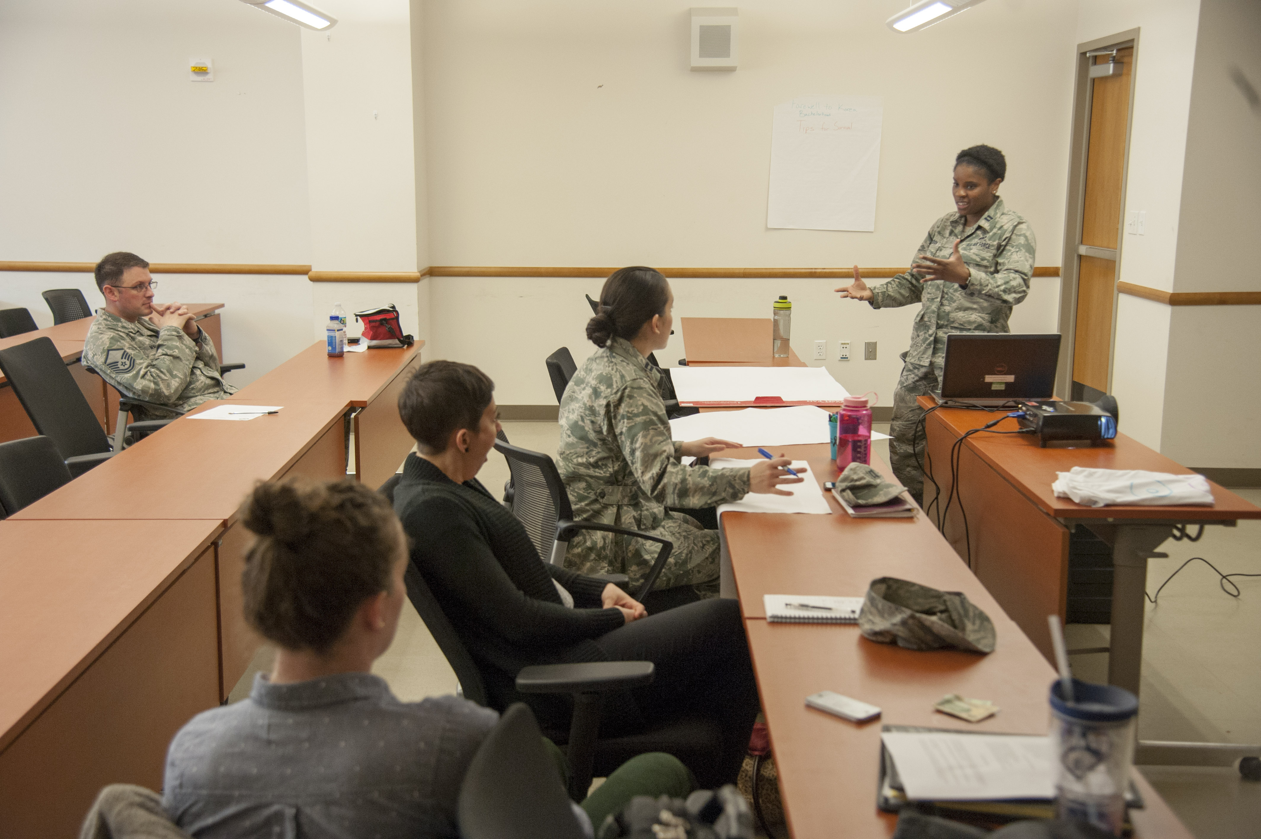 Capt. Sevrena Gordon, right, 51st Fighter Wing sexual assault response coordinator, discusses long distance relationships during the Sexual Assault Awareness Prevention Month “Brown Bag Lunch Series” on Osan Air Base, Republic of Korea, April 13, 2016. The weekly lunch series were discussions on topics intended to bring awareness to sexual assault and how it can be prevented. (U.S. Air Force photo by Staff Sgt. Jonathan Steffen/Released)