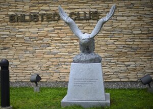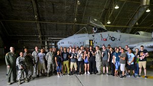 Members of Team Osan pose with the actors and crew members of “Lobby Hero” in front of an A-10 Thunderbolt II during a visit to Osan Air Base, Republic of Korea, Aug. 13, 2016. The cast and crew visited a maintenance hangar and the A-10 flight simulator prior to the play to gain an understanding of