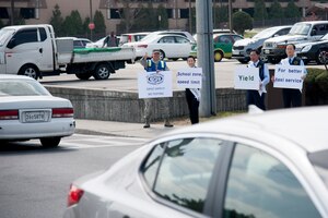Senior Master Sgt. Sean Rouiller, 51st Fighter Wing safety superintendent, and employees from the Osan Army and Air Force Exchange Service taxi service, encourage motorists to drive safe April 11, 2016, at Osan Air Base, Republic of Korea. The safety campaign was a joint promotion with the 51st