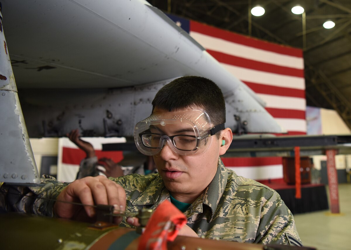 From left to right: U.S. Air Force Staff Sgt. Ja Mouri Moye, Senior Airman William Jackson and Senior Airman Alan Oseguera, weapons load crew members assigned to the 25th Aircraft Maintenance Unit, 51st Aircraft Maintenance Squadron, stand in front of an A-10 Thunderbolt II at Osan Air Base, Republic of Korea, Jan. 11, 2019. The team participated in a friendly weapons load crew competition against their counterpart from the 36th Aircraft Maintenance Unit, 51st AMXS. (U.S. Air Force photo by Sergio A. Gamboa)