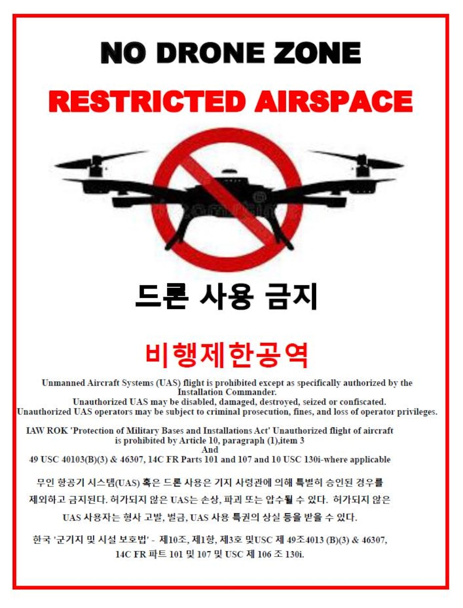 OSAN AIR BASE, Republic of Korea -- As a reminder for servicemembers and their families living on Osan Air Base, Republic of Korea, the operation of unmanned aircraft systems (UAS) on the installation is prohibited. Additionally, Korean Law prohibits UAS flights within six miles of active air fields and military installations.