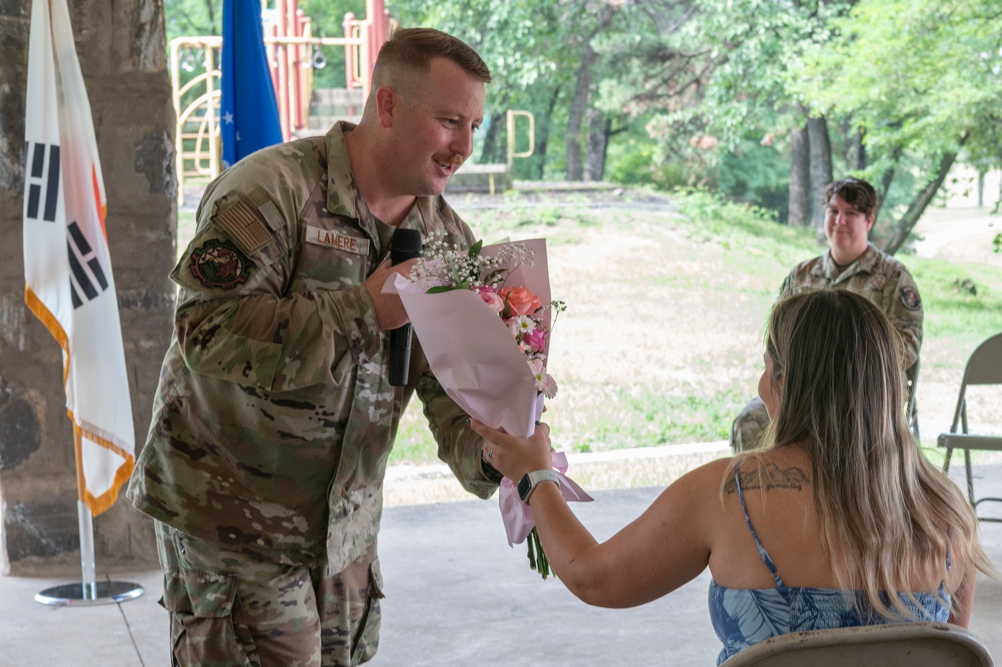 OSAN AIR BASE, Republic of Korea -- U.S. Air Force Capt. Zachary LaMere took command of Air Force Technical Applications Center, 709th Technical Maintenance Squadron, Detachment 403 during a change of command ceremony at Osan Air Base, Republic of Korea, June 24, 2024. A change of command ceremony is a symbol of seamless transition, instilling unity and readiness. As the new commander, LaMere is tasked with maintaining partnership with the Korea Institute of GeoScience and Minerals, supporting nuclear treaty monitoring across the area of responsibility and to serve as AFTAC’s liaison officer to mission partners in the ROK. (U.S. Air Force photo by Staff Sgt. Ashley N. Mikaio)