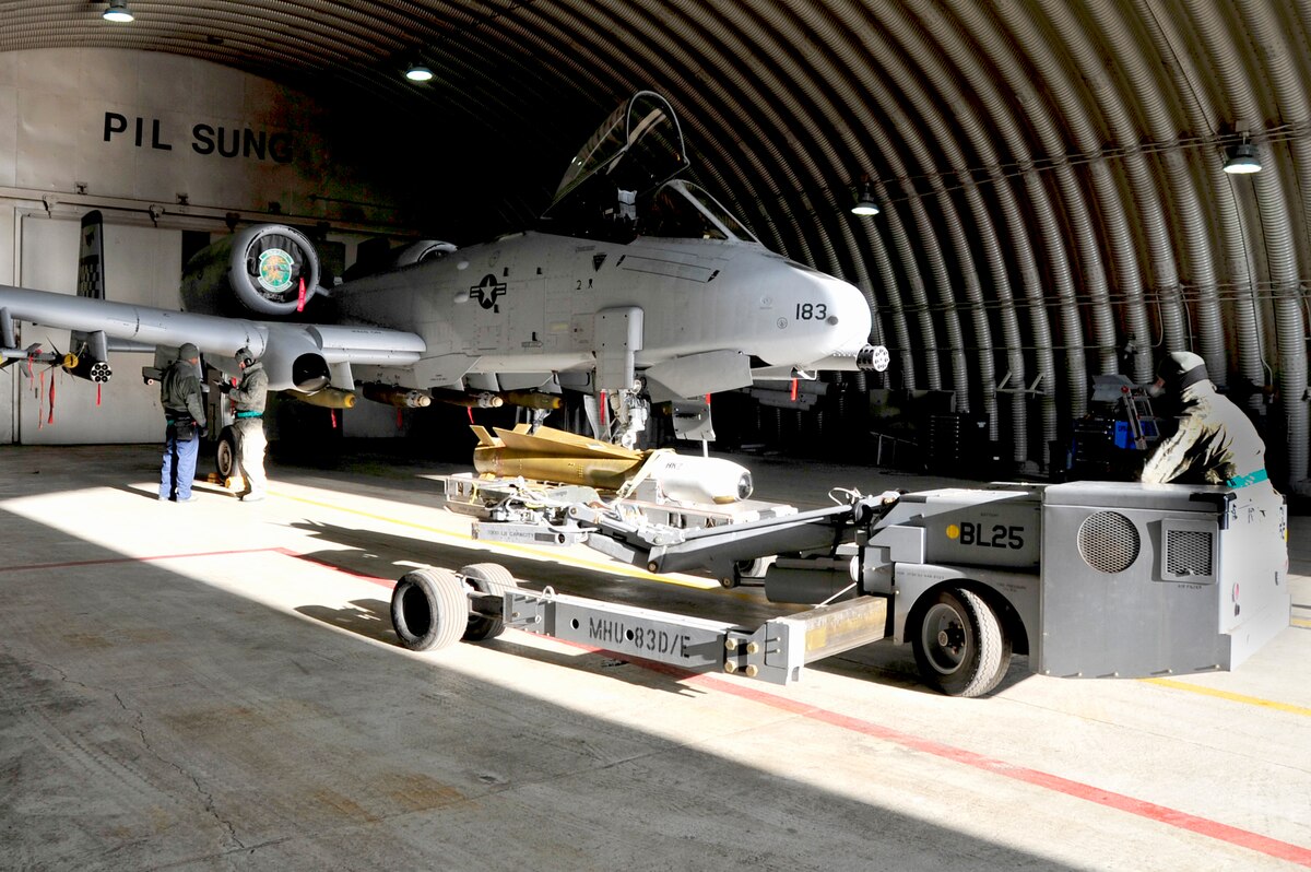 Staff Sgt. Angel Dearce, 25th Fighter Squadron weapons load crew chief, guides an AGM-65 Maverick to attach to an A-10 Thunderbolt II in preparation for operational readiness exercise Beverly Bulldog 13-02 at Osan Air Base, Republic of Korea, Feb. 8, 2013. The AGM-65 Maverick is a tactical, air-to-surface guided missile designed for close air support, interdiction and defense suppression mission. It provides stand-off capability and high probability of strike against a wide range of tactical targets, including armor, air defenses, ships, transportation equipment and fuel storage facilities. (U.S. Air Force photo/Airman 1st Class Alexis Siekert)