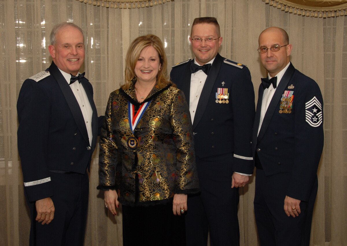 OSAN AIR BASE, Republic of Korea -- Tech. Sgt. Jesse Jacobson, assigned to the Pacific Air Forces Silver Flag Exercise Site in Kadena AB, Japan, is the 7th Air Force annual award winner in the Noncommisioned Officer category. Here he poses with Lt. Gen. Stephen Wood, 7th AF commander, and Chief Master Sgt. Raymond Allen III, 7th AF command chief.