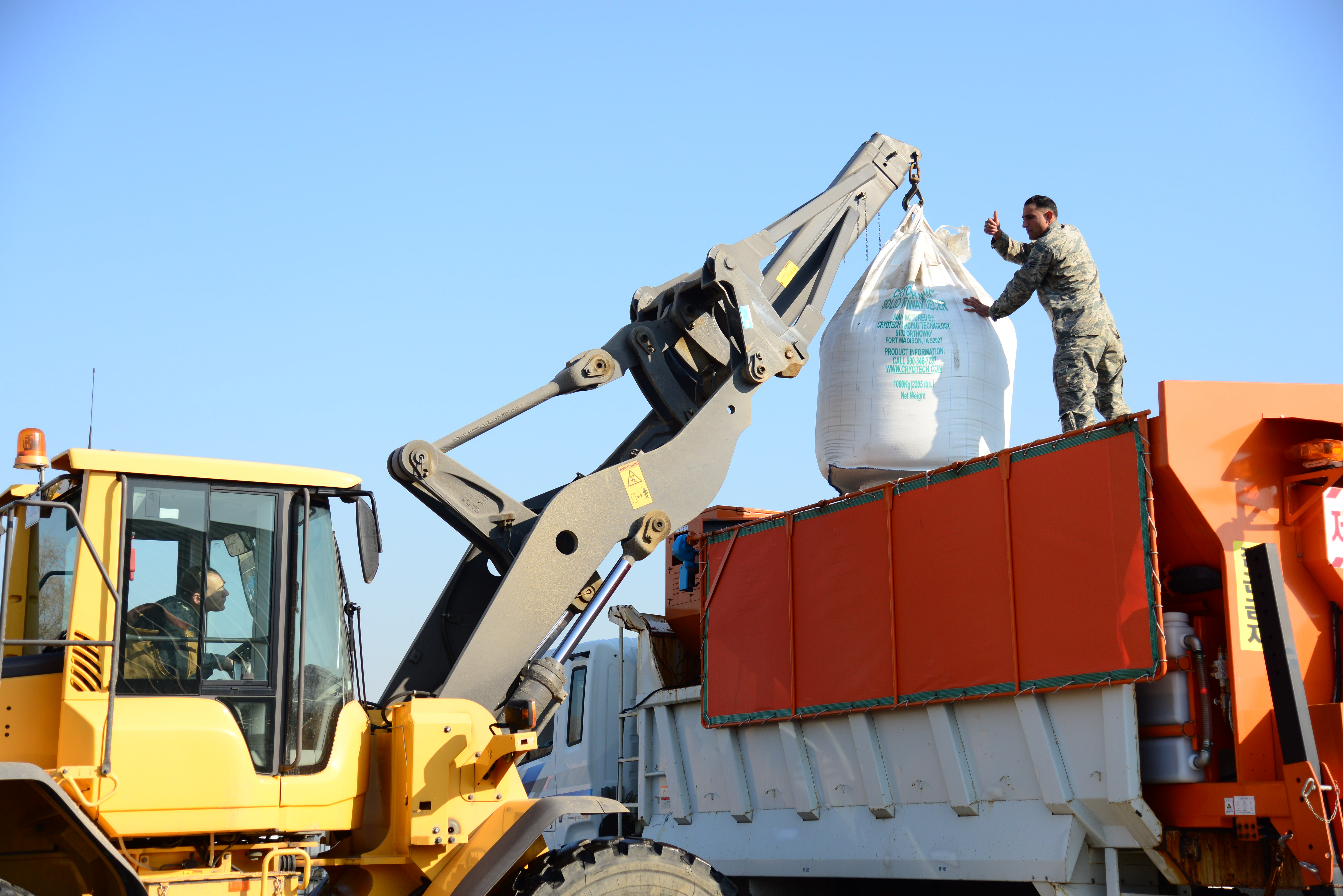 Staff Sgt. Ernest Opoku, 51st Civil Engineer Squadron pavement and construction equipment craftsman, preps a 1,100 pound bag of deicing chemicals at Osan Air Base, Republic of Korea, Dec. 8, 2015. The chemicals, once mixed with sand, will be used to keep the roads clear of ice while providing vehicles with additional traction. (U.S. Air Force photo/Staff Sgt. Amber Grimm)