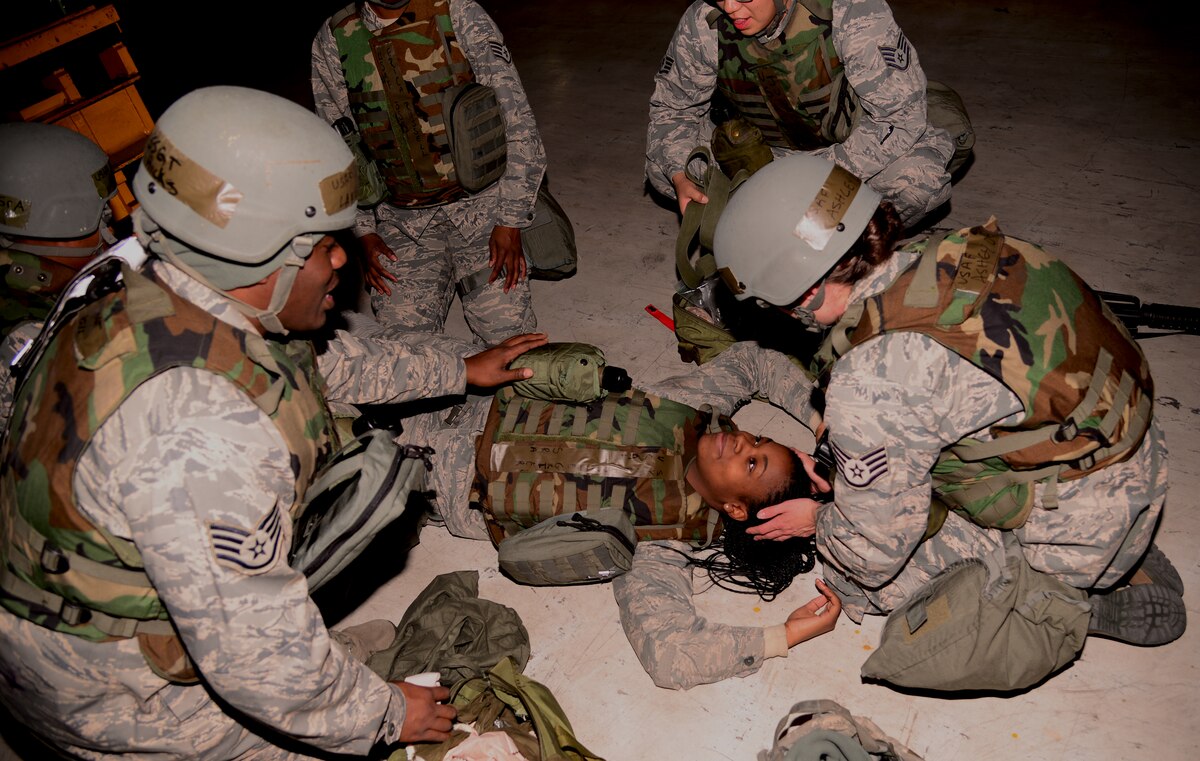 Team Osan members assigned to the 51st Logistics Readiness Squadron materials management flight perform Self-Aid Buddy Care on a simulated victim Nov. 2, 2015, at Osan Air Base, Republic of Korea. These Airmen are just a small part of the 16,000 participants of the readiness exercise Vigilant Ace 16, which focuses on enhancing the readiness and interoperability of U.S. and ROK forces. (U.S. Air Force photo/Staff Sgt. Benjamin Sutton)