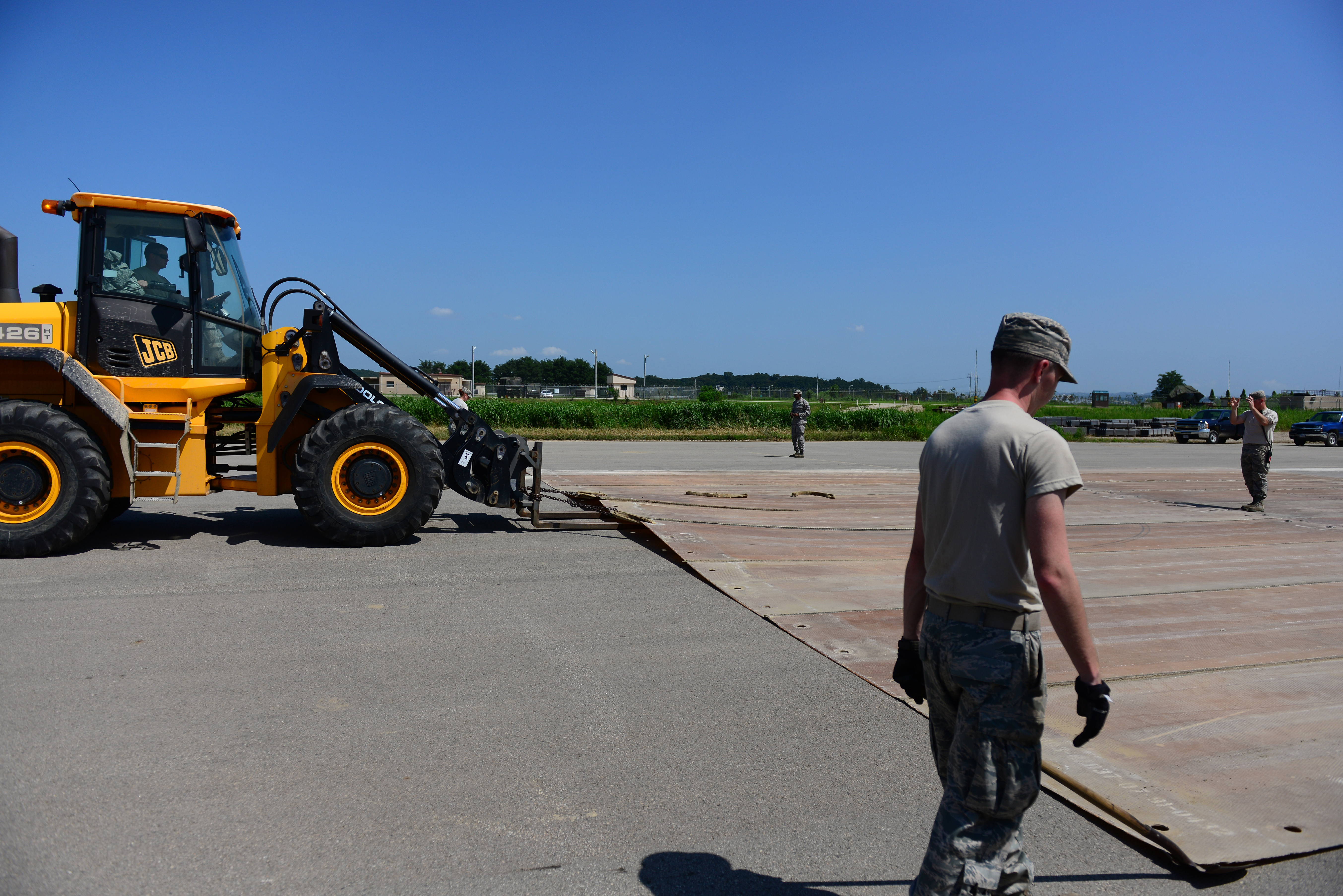 Airmen from the 51st Civil Engineer Squadron pavement and constructions equipment shop, use a combination of heavy equipment and hand tools, to repair a crater during airfield damage repair training at Osan Air Base, Republic of Korea, Aug. 18, 2015. While the overall repair time can vary based on the size, complexity and nature of the situation, the 51st CES toils non-stop to get the base’s airfields up and running.