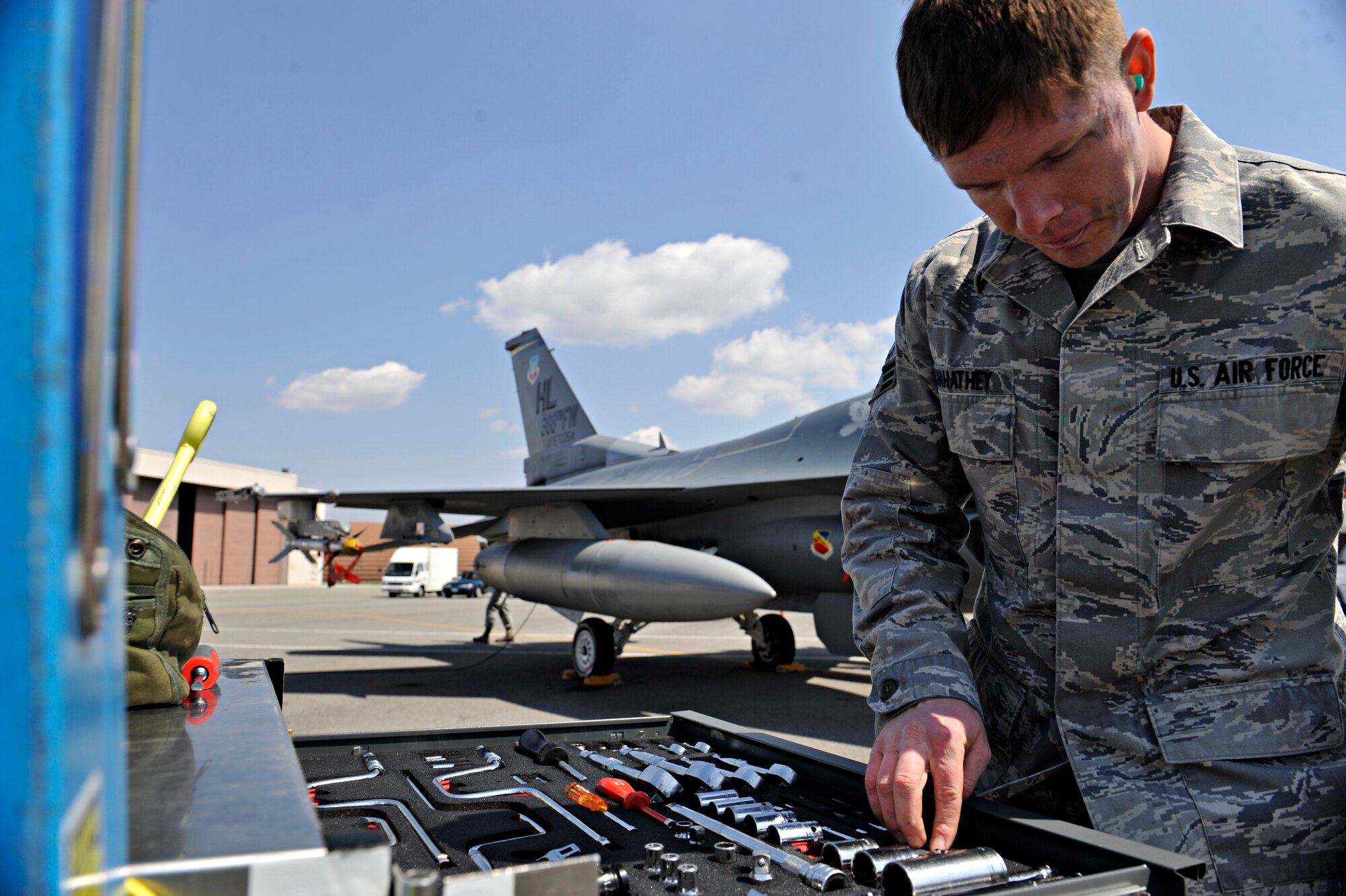 Senior Airman Shaun Mahathey, 421st Aircraft Maintenance Unit weapons load crew member, arranges tools in his team’s tool box during a quarterly weapons load crew competition at Osan Air Base, Republic of Korea, April 4, 2014. In addition to the weapons loading, crews are also inspected on their dress and appearance, and have their tool boxes inspected for good order to determine the best weapons load crew of the quarter. (U.S. Air Force photo/Senior Airman Siuta B. Ika)