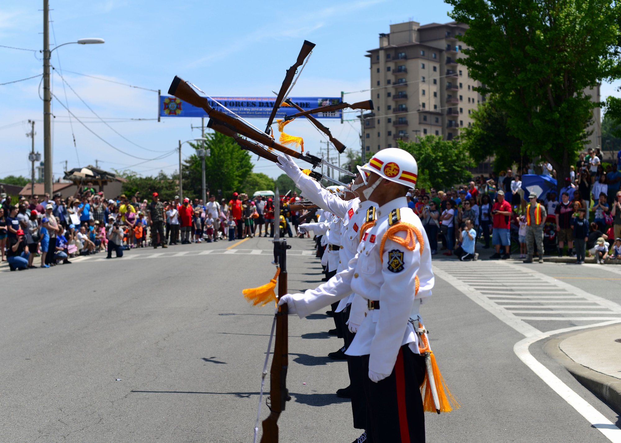 The Republic of Korea marine corps drill team perform a rifle movement during a demonstration at the Armed Forces Day Parade, Osan Air Base, Republic of Korea, May 21, 2016. The drill team put on the demonstration at the end of the parade, which was hosted by the local Veterans of Foreign Wars, Post 10216. (U.S. Air Force photo by Senior Airman Victor J. Caputo/Released)