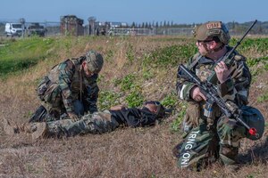 U.S. Air Force Senior Airman Noah Yates, left, 51st Civil Engineer Squadron Explosive Ordnance Disposal technician, and Staff Sgt. Carson Hudson, 51st CES EOD team leader, respond to a simulated unexploded ordnance call during the Vigilant Defense 24 training event at Osan Air Base, Republic of