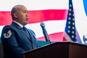 U.S. Air Force Airmen assigned to the 51st Fighter Wing listen to the wing leadership’s closing remarks during the annual awards ceremony at Osan Air Base, Republic of Korea, Feb. 21, 2025. U.S. Air Force Col. William McKibban, 51st FW commander, addressed Mustang Airmen on the importance of esprit